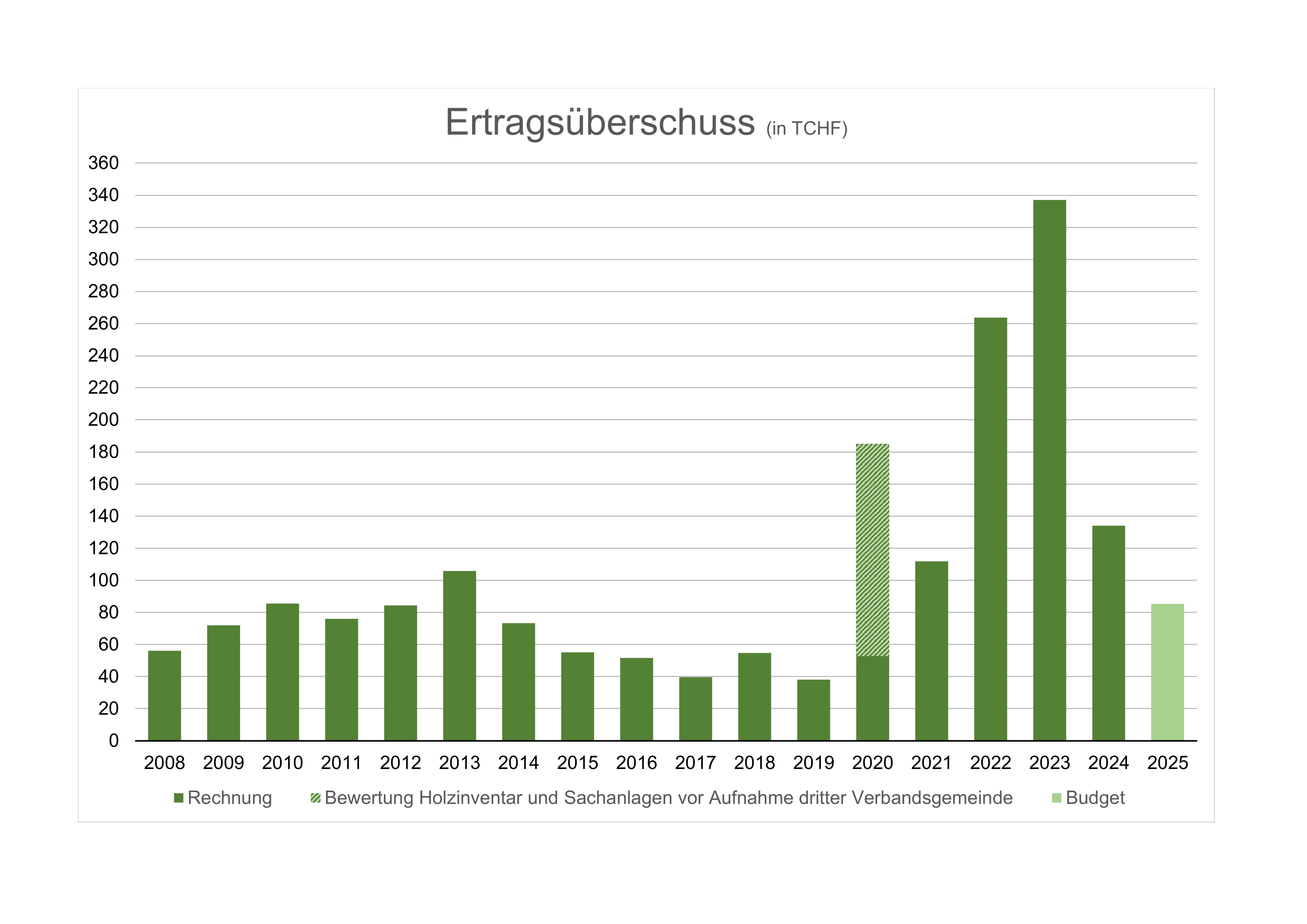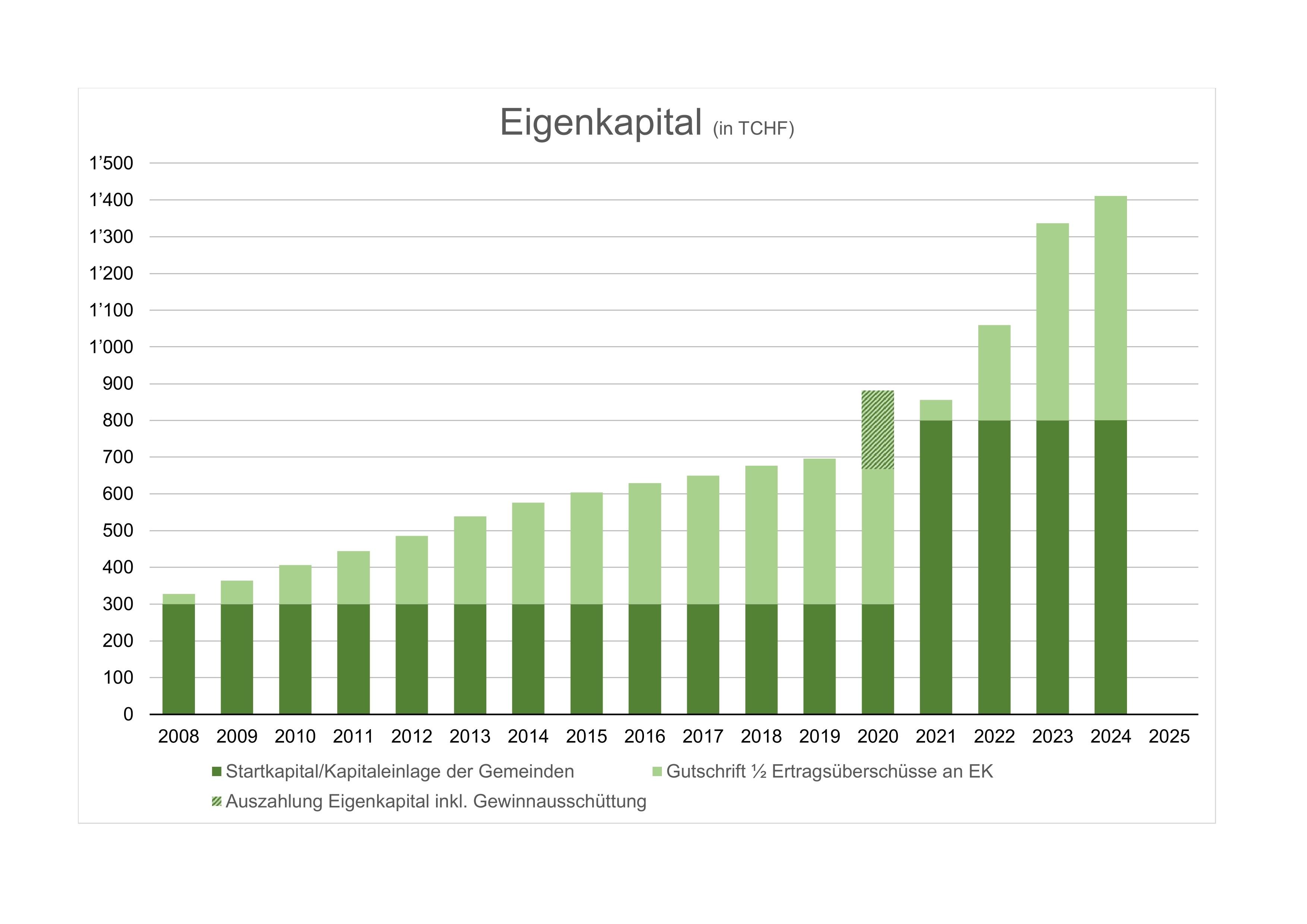 Die frühere FBG startete im Jahr 2008 mit einem Eigenkapital von Fr. 300'000. Da die Hälfte des Ertragsüberschusses jeweils dem Eigenkapital gutgeschrieben wird, steigt dieses kontinuierlich. Mit dem Beitritt der Gemeinde Holderbank zum ZV Forst Thal im Jahr 2021 wurden die Kapitalanteile aufgrund der Waldanteile neu festgelegt (Auszahlung und Einzahlung). Aus den laufenden Gewinnen werden wieder Reserven gebildet (Eigenkapital).